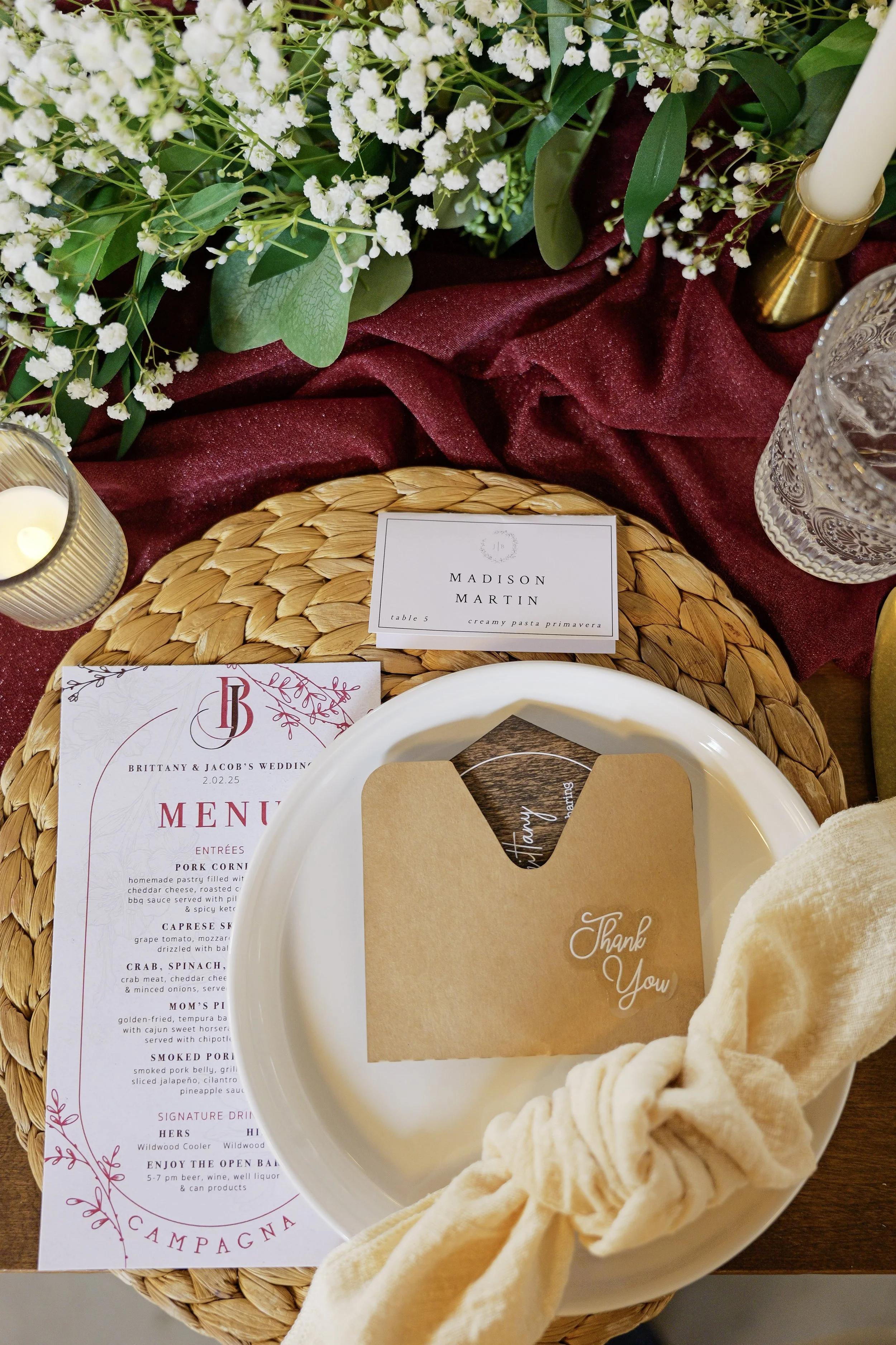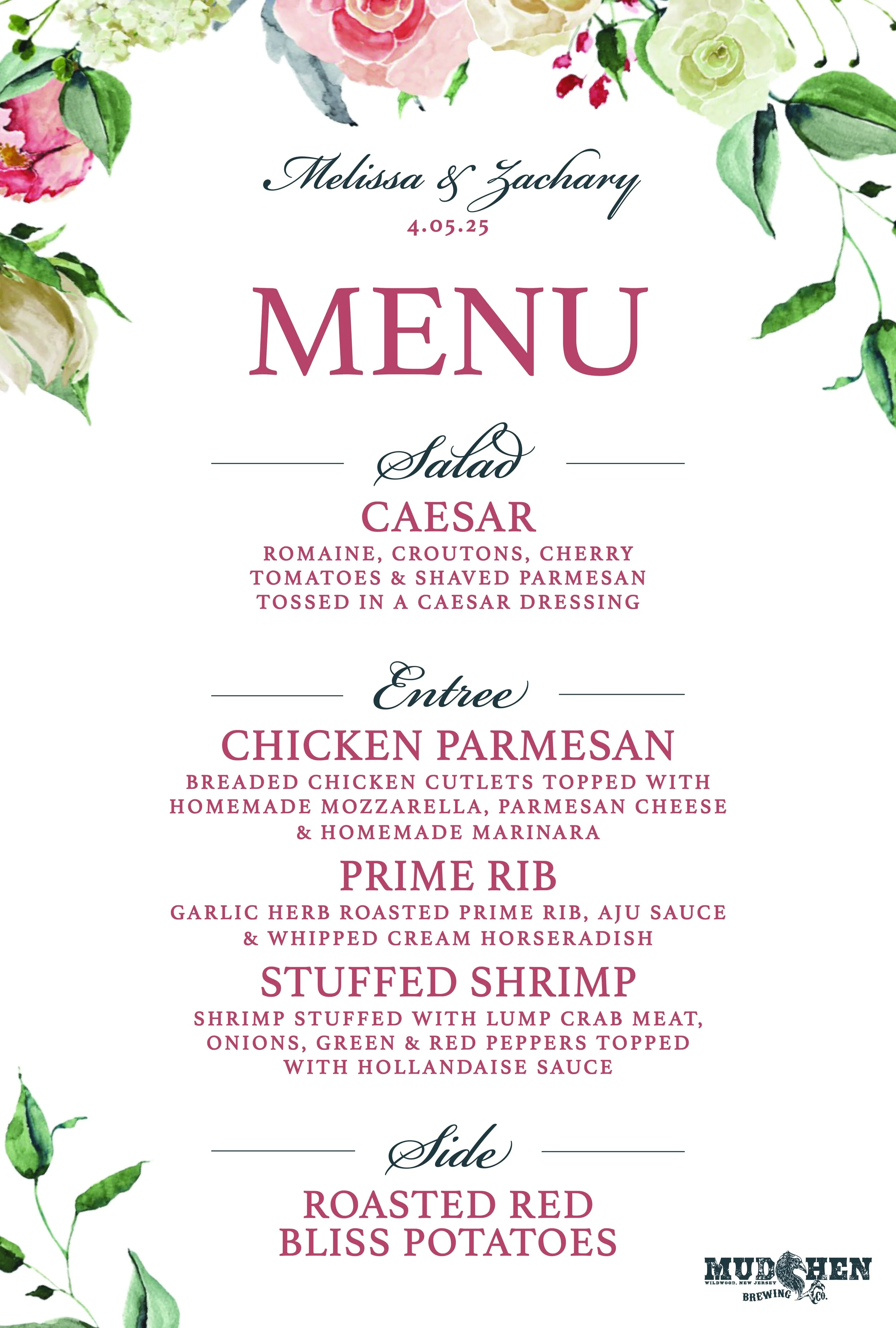 Over the course of the past year, I have had the privilege of working alongside members of MudHen Brewing Company’s marketing and catering team. With continuous events hosted by the company, such as weddings, bridal/baby showers, and various parties, the need for menu designs was necessary to add a unique touch to each event. Below is a range of different menu designs, with professional photos taken by our photographer, and setup arranged by our catering manager.